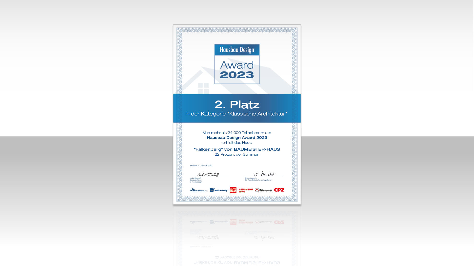 Urkunde Platz 2 für Haus Falkenberg beim Hausbau Design Award.