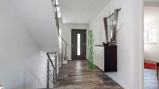 Stilsicher, modern und gleichzeitig von klassischer Zeitlosigkeit ist das Einfamilienhaus Cronenberg von BAUMEISTER-HAUS, das ganz auf die Bedürfnisse der vierköpfigen Familie zugeschnitten wurde. Ein Highlight des vollunterkellerten Hauses ist die eigene Sauna, die gemeinsam mit drei Stauräumen sowie dem Technikraum im Keller Platz findet. Das Herzstück des Erdgeschosses ist der über 72 m² große offene Wohn-, Ess- und Koch- bereich, der Dreiviertel der Fläche einnimmt und über eine große Glas-Flügeltür betreten wird. Diese schützt nicht nur vor Zugluft, sondern sorgt auch für Privatsphäre. Zur offenen Küche gehört ein praktischer Vorratsraum mit Schiebetür. Im Dachgeschoss befinden sich zwei großzügige Kinderzimmer, das Elternschlafzimmer sowie das gemeinsame Familienbad mit Dusche, Badewanne und zwei großen Waschbecken.