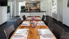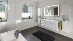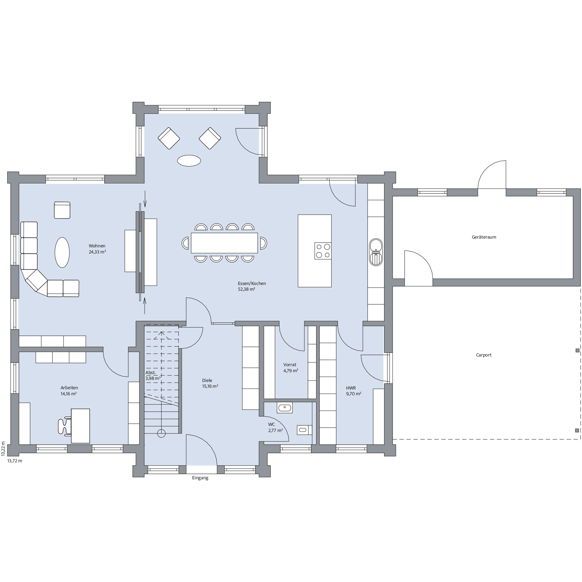 Das herrschaftliche Gebäude von Haus Dorn wirkt für das Auge wahrlich anziehend. Zu der klaren Architektur wurde eine kunstvolle Verklinkerung gewählt. Vor dem Walmdach thront ein Zwerchgiebel. Das Anthrazit von Dach und Fenstern ist eine außergewöhnliche Ergänzung zu der Fassade in Erdtönen. Das Einfamilienhaus verfügt über insgesamt 241 m² Wohnfläche. Im Erdgeschoss lädt ein großzügiger Koch-/Essbereich zu vielen gemeinsamen Stunden ein. Aus der Küche können ein Vorratsraum und der Hauswirtschaftsraum erreicht werden. Von dort gelangt man zum Carport mit angeschlossenem Geräteraum. Per Schiebelemente kann der Essbereich vom Wohnzimmer getrennt werden. Zudem bietet ein Arbeitsraum neben dem Wohnbereich Ruhe. Auch im Obergeschoss wurde optimal an die Bedürfnisse aller Familienmitglieder gedacht. So verfügen die beiden Kinderzimmer über ein eigenes Duschbad. Der Bereich für die Eltern umfasst ein Schlafzimmer, einen Ankleideraum sowie ein Bad mit Dusche und Badewanne. Ebenso gibt es hier ein weiteres Arbeitszimmer, sogar mit eigenem Balkon. Ein großer Abstellraum bietet Platz für Spielzeug und viele andere Dinge.