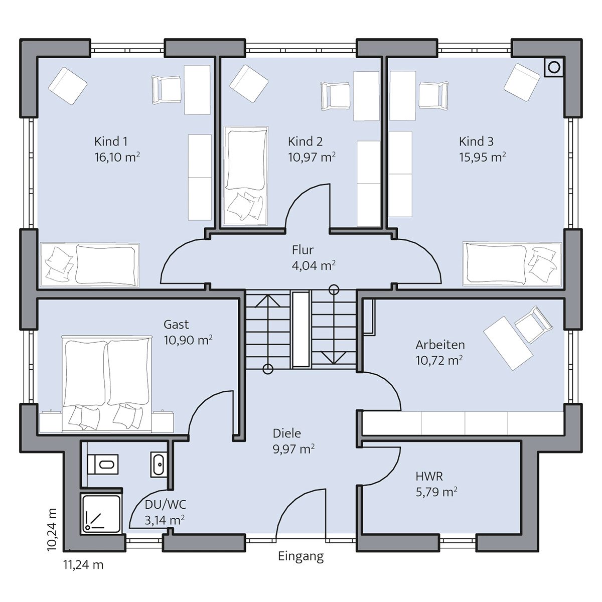 das Äußere des Hauses. Bewusst abgesetzt wurde der Eingangsbereich des Gebäudes - bis ins Dach hinein. Material und Farbe der Fassade werden vom klassischen Ziegelrot dominiert, unterbrochen von den grau gehaltenen Putzbändern mit den Fenstern in gleicher Farbe.
