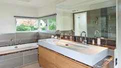 Man kann sich gar nicht entscheiden, wo denn nun der Lieblingsplatz sein soll. In dem Licht durchfluteten Essbereich? Im Anbau mit der extra großen Fensterfront? Oder auf der Terrasse, die wie ein breiter Steg den Pool einfasst. Der farbig abgesetzte Anbau mit seinem Flachdach trennt sich äußerlich optisch vom Haus und wirkt als eigener Baukörper. Von innen gesehen hingegen vereint er sich mit der Terrasse und vergrößert den Wohnbereich.