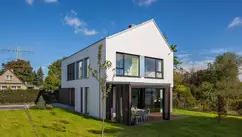 Wer ein Haus im zeitgemäßen Stil sucht, für den ist Haus Möller ein Volltreffer. Seine schlanke Linienführung und das asymmetrische Satteldach ohne Überstand verleiht dem Baukörper seinen puristischen Charakter, der sich damit ideal für schmale Grundstücke eignet.