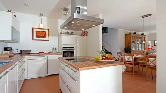 Dieser Entwurf entwickelte sich nach der Topografie des Baugrundstücks. Die Neigung war ideal für eine Lösung mit versetzten Geschossen: viel Nutzungsreserve unter dem Dach, Ruhezone der Eltern, Kinderebene, Gastbereich, Wohnen und Kochen auf Gartenniveau und Kellerräume. Alle Ebenen sind durch die offene Treppe miteinander verbunden. Die äußere Gestaltung zeigt modern-puristische Züge.