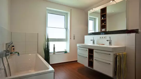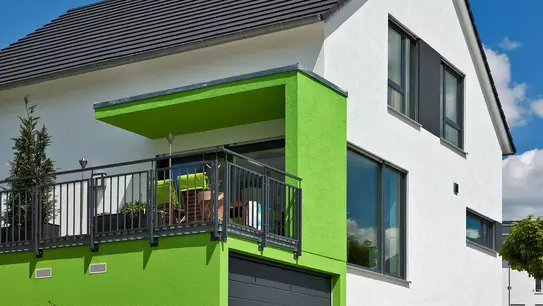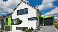 Neben dem frischen Grün der oberen Garage fallen von Außen am Haus der Familie Thiel besonders die dazu reduzierte weiße Putzfassade, das schwarze Dach und die großzügigen schwarzumrahmten Fensterflächen auf. In dieses moderne Erscheinungsbild mit puristischer Linienführung fügen sich der vorgezogene Eingang sowie die scheibenförmigen Wandsegmente auf dem Dach der unteren Garage, die die Terrasse vor Einblicken und Witterung schützt, stimmig ein. Gemeinsam mit dem herausragenden Keller passt sich das Ensemble aus Hauptgebäude und Anbauten optimal an die topografischen Gegebenheiten ein.