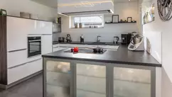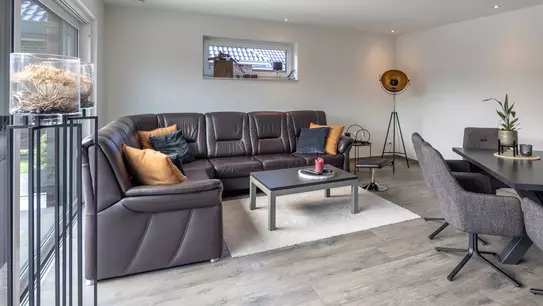 Haus Waldmüller zeichnet sich durch moderne, minimalistische Architektur aus und ist als Effizienzhaus nachhaltig konzipiert. Die auffällige, rot verklinkerte Fassade und das asymmetrische Pultdach verleihen dem Einfamilienhaus ein modernes Aussehen. Der ebenerdige Bungalow umfasst eine Wohnfläche von 166 m². Architektonische Innovation und einzigartiges Design werden bereits im großzügigen Wohnbereich von 33 m² und im angrenzenden Ess-/Kochbereich von über 24 m² sichtbar, die durch ein offenes Raumkonzept ideal für Familienaktivitäten sind. Der Elternschlafbereich bietet ein Ankleidezimmer sowie ein Bad mit Gartenzugang und erhöht den Wohnkomfort erheblich. Zusätzlich gibt es zwei Kinderzimmer mit je knapp 14 m² und ein Arbeitszimmer. Ein weiteres Duschbad erhöht den Komfort für Bewohner und Gäste. Die flexible Raumaufteilung unterstützt eine vielseitige Nutzung. Die technische Ausstattung beinhaltet eine moderne Heizungsanlage mit Fernwärme und Fußbodenheizung sowie 3-fach verglaste Fenster, die eine exzellente Isolierung bieten und den Energieverbrauch senken. Eine über 4 Meter breite Schiebetür im Wohnbereich öffnet sich zu einer großzügigen, überdachten Terrasse und schafft eine nahtlose Verbindung zum Garten, ideal für Freizeit und Entspannung im Freien. Haus Waldmüller vereint Ästhetik, Komfort und Funktionalität, bietet höchste Lebensqualität und ist eine durchdachte Wohnlösung.
